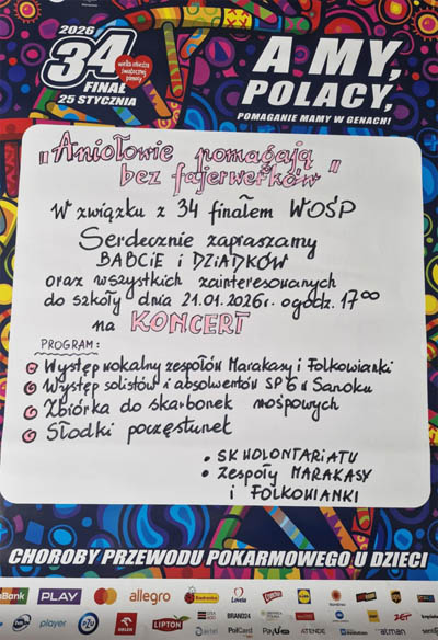 Już w środę 21 stycznia zapraszamy wszystkie Babcie i Dziadków oraz chętne osoby na koncert „ANIOŁOWIE POMAGAJĄ BEZ FAJERWERKÓW”, który odbędzie się o godzinie 17.00 w naszej szkole na Sali Gimnastycznej.